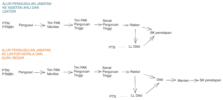 Kewenangan mempromosikan jabatan dosen dari Asisten Ahli sampai Lektor di perguruan tinggi negeri (PTN) dipegang oleh universitas saja. Tapi untuk perguruan tinggi swasta (PTS), prosesnya juga melibatkan Lembaga Layanan Dikti (LL Dikti) di tiap wilayah.