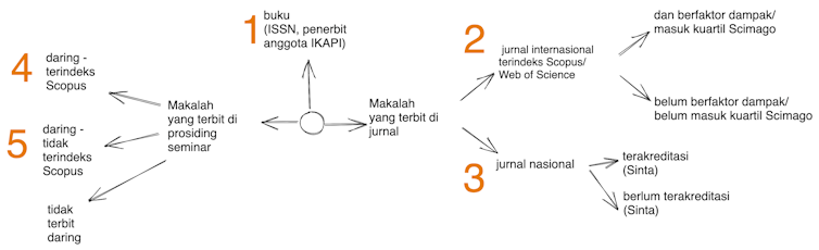 Kasta tertinggi dengan skor maksimum 40 diberikan untuk makalah yang terbit di jurnal internasional tertentu. Sementara, kasta terendah (skor hanya 1) adalah untuk artikel populer seperti yang sedang Anda baca saat ini.